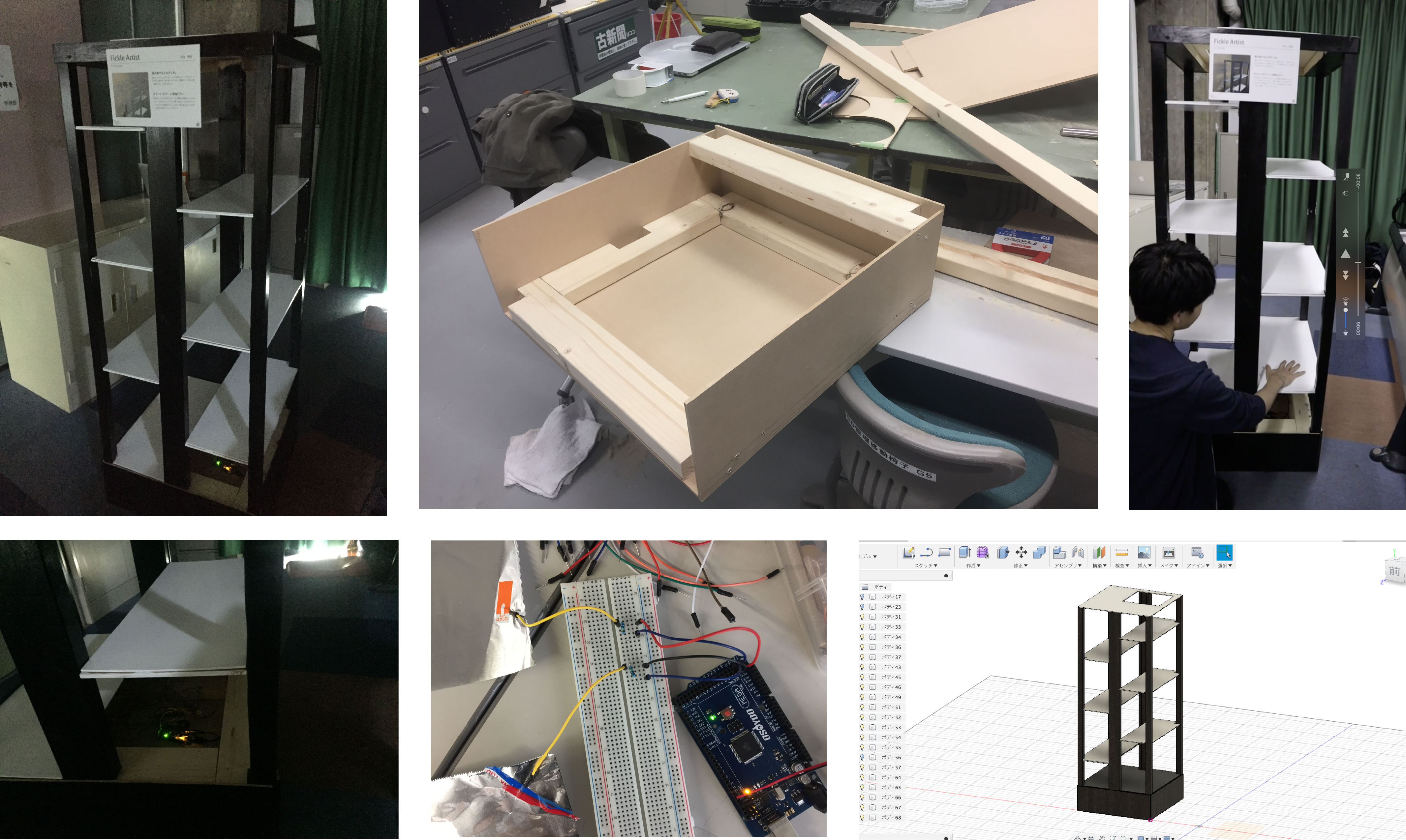 CADソフトで全体の設計を行い、電動工具で木材を加工してそれぞれのパーツを切り出し、組み立てました。サンダーでやすって形を整えてから、ピアノをモチーフにして白と黒に塗装しました。