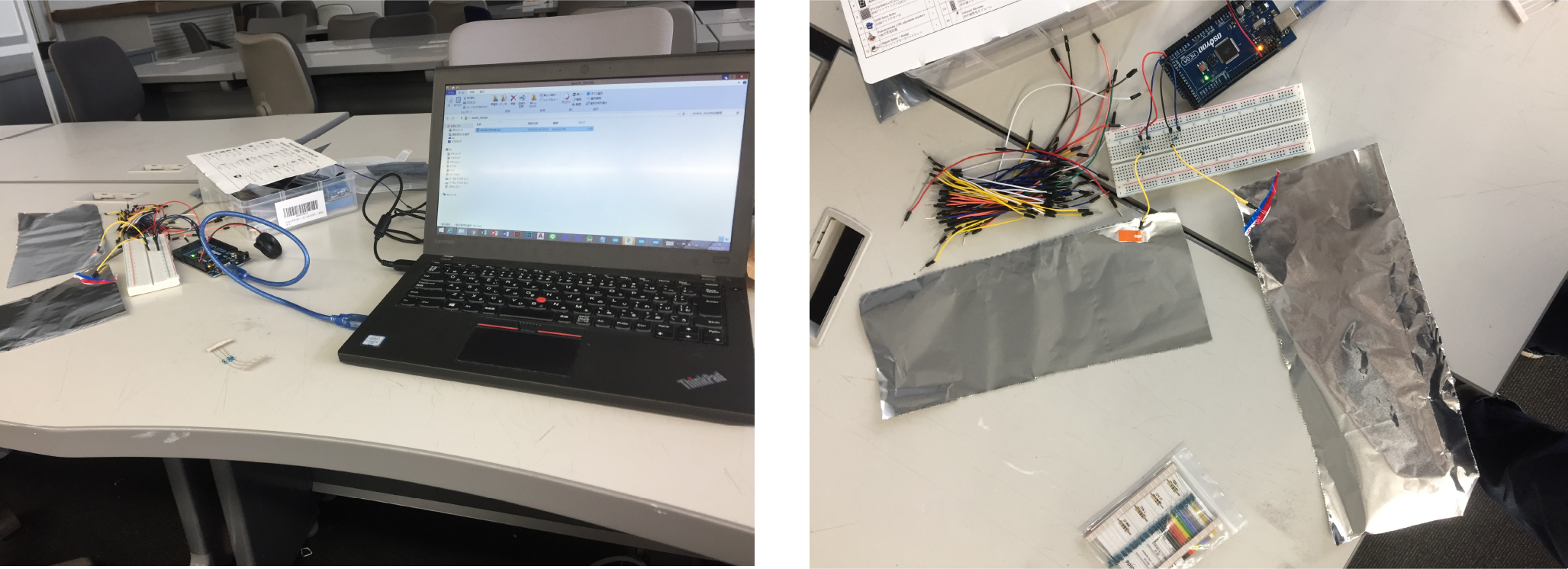 アルミホイルで静電容量方式のセンサーを作り、arduinoに繋げ、感度を調節しました。加えて音を出すための圧電スピーカーも繋げ、下の段から猫の接触に合わせて「ドレミファソラシド」の音階が鳴るようにプログラムを作成し、これをキャットタワーに取り付けました。